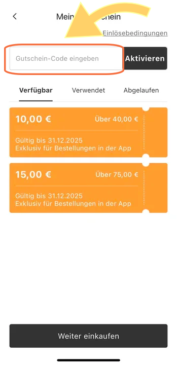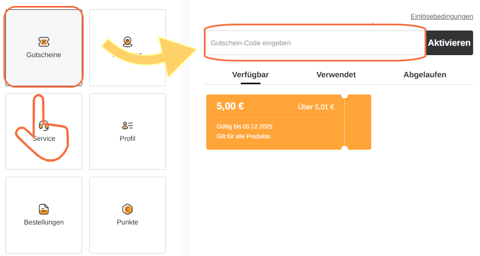 2.Wählen Sie dort die Option „Gutscheine“ aus und geben Sie anschließend Ihren Gutscheincode ein.