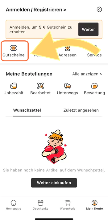 2.Wählen Sie dort die Option „Gutscheine“ und geben Sie anschließend Ihren Gutscheincode ein.