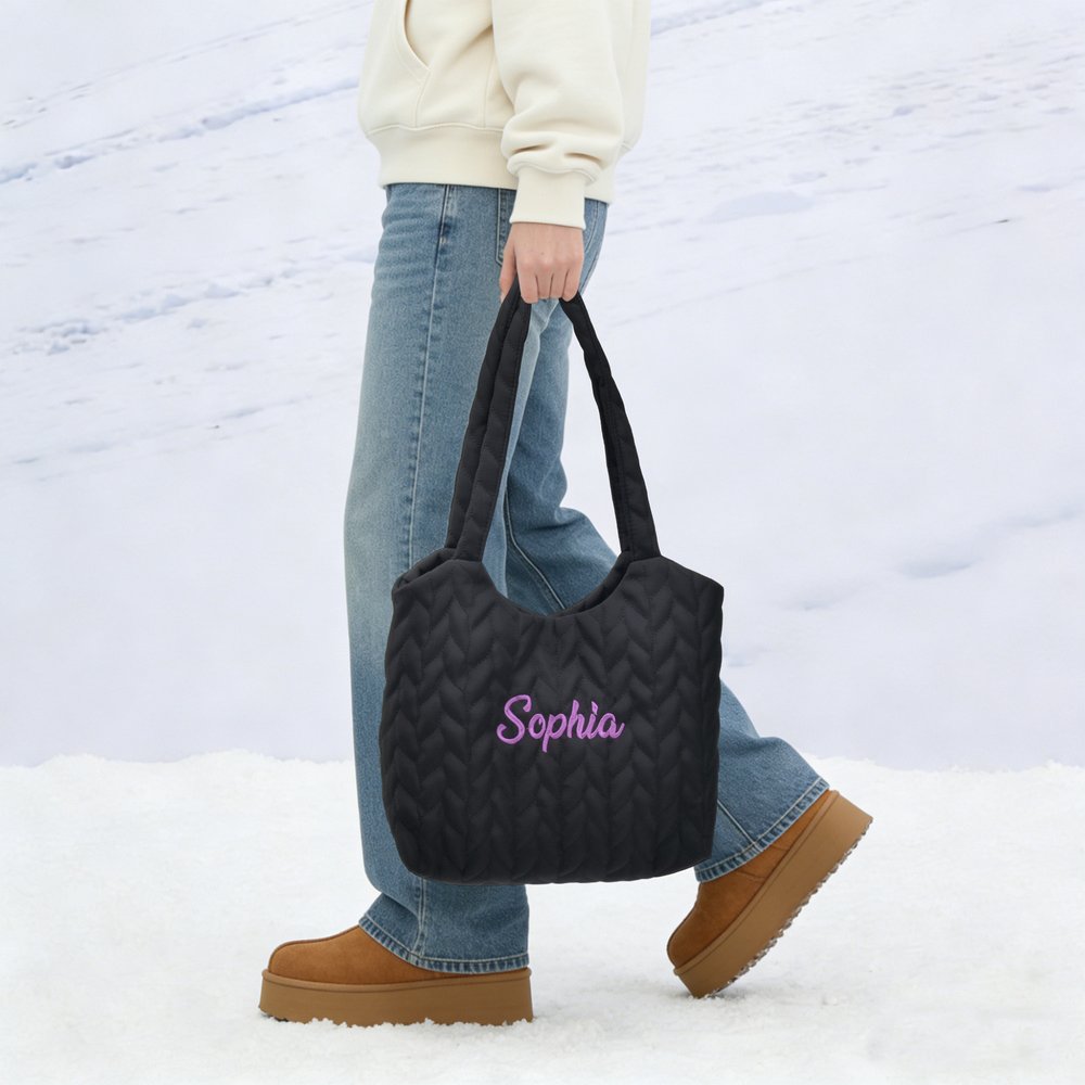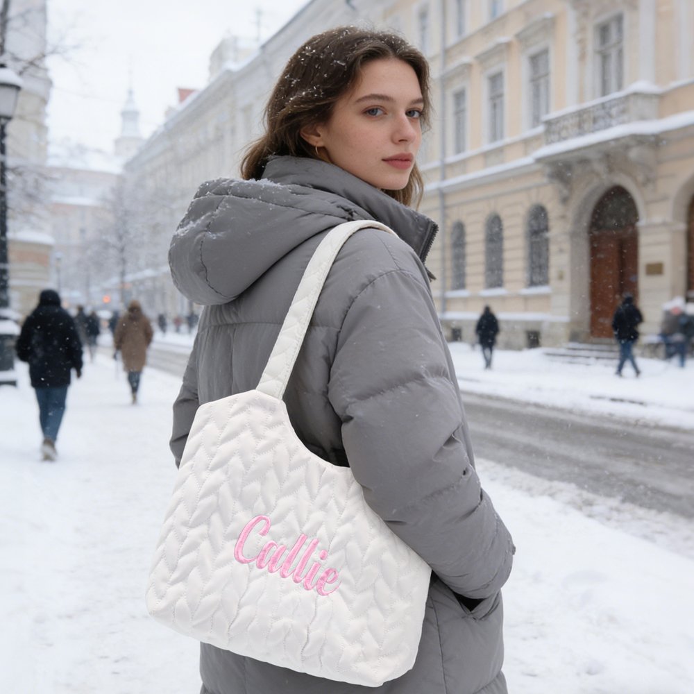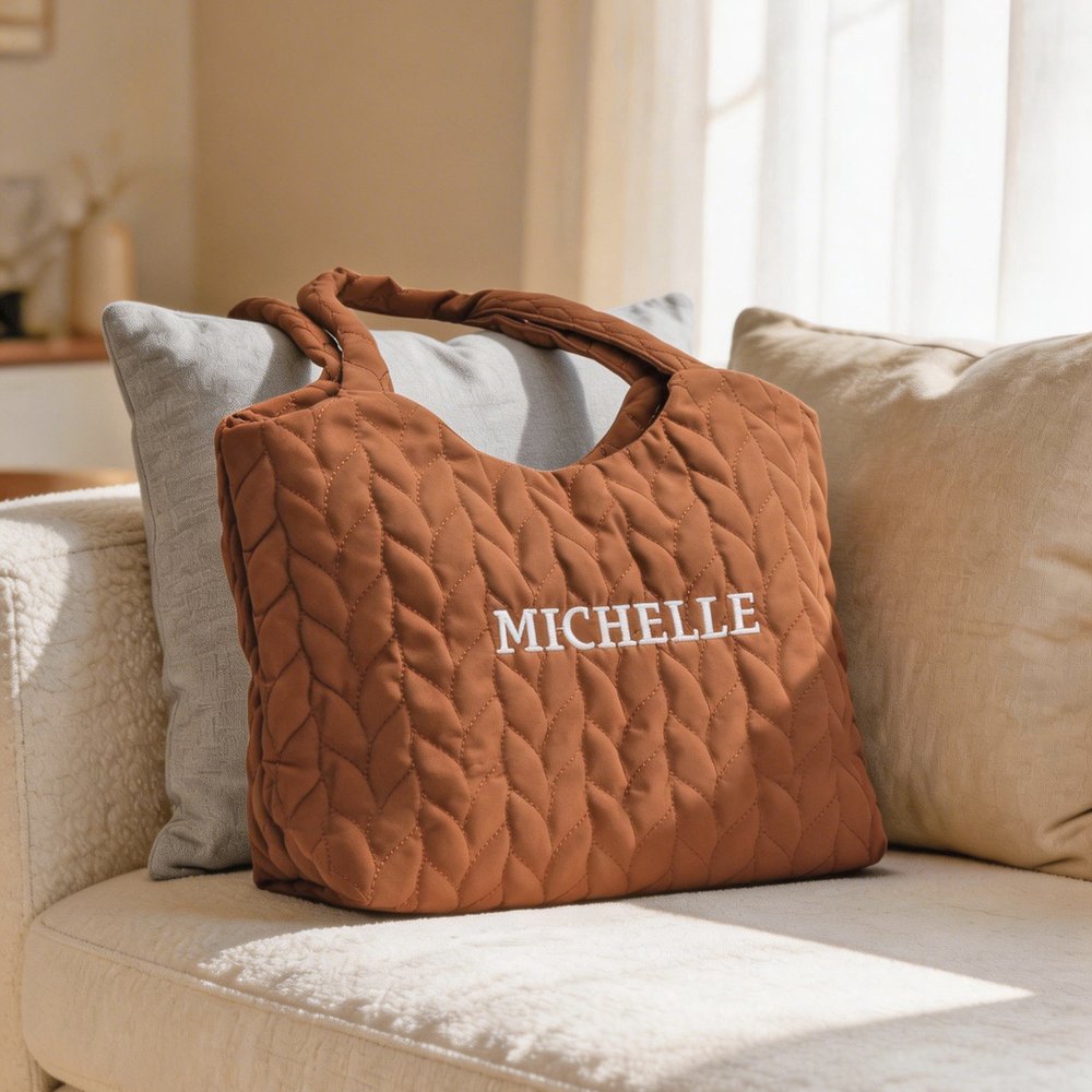 Das exquisite Rautensteppmuster sorgt für eine sanfte und gemütliche Atmosphäre. Individuell anpassbar mit einem persönlichen Namen, erhältlich in verschiedenen Garnfarben, was jede Tasche zu einem echten Unikat macht. Perfekt für verschiedene Stile, die einen Hauch von Raffinesse zu Ihrem täglichen Look hinzufügen.